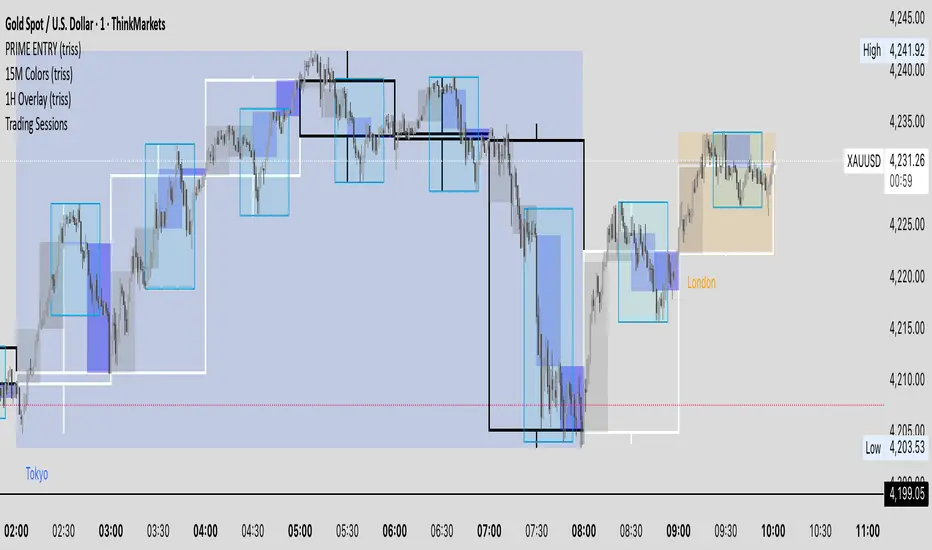 Overlay of the 1 Hour candle, white for bullish and black for bearish.