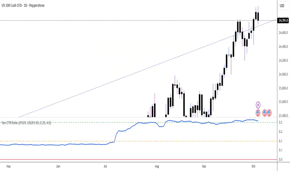 Shows risk of yen carry trade unwinding. Based on cost to borrow from Japan to buy us stocks compared to interest rate in USA.