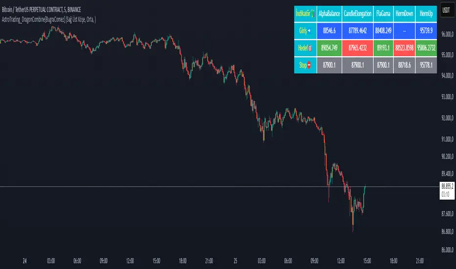 The “AstroTrading_DragonCombine” indicator is a multi-faceted tool that merges five distinct trading setups into one comprehensive display. Each sub-indicator utilizes a unique method—ranging from extreme candle moves and Fibonacci extensions to EMA crossovers—to determine entry, target, and stop levels. These levels are then neatly summarized in a table overlay on the chart. By combining these approaches, traders can gain a broader perspective on market conditions and potential reversal points, enhancing their decision-making process while adhering to sound risk management principles.