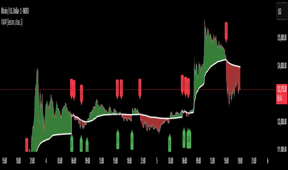 Buy/sell signals are generated when the EMA crosses above or below VWAP.