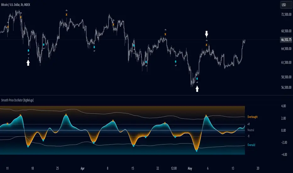 The Smooth Price Oscillator by BigBeluga is a refined, noise-filtered indicator designed to highlight mean reversion points with enhanced clarity. By providing both strong and simple reversion signals, as well as dynamic overbought/oversold bands, this tool allows traders to spot potential reversals and trend continuations with ease. Its dual representation on the oscillator and the main price chart offers flexibility and precision for any trading strategy focused on capturing cyclical market movements.