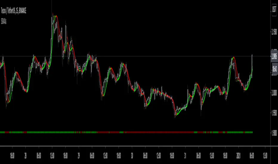 The 2 user defined moving averages can either be an EMA or SMA. The 1st MA is set to the 200 SMA by default, which also triggers the Trend signals at the bottom of the chart. The 2nd MA is set to the 6 SMA by default.