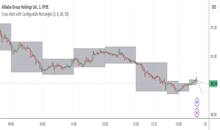 This TradingView script, **"Cross Alert with Configurable Rectangles"**, is a technical analysis tool designed to help traders visualize and analyze market trends effectively. It combines configurable moving averages with customizable timeframe-based rectangles for highlighting price ranges.
