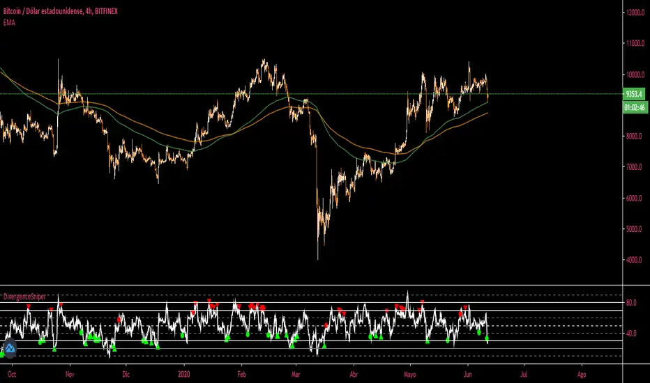 ----DivergenceSnipper is an indicator that marks the divergences in any temporality, on an RSI, and possible retracements that are not very reliable, but to take into account, green arrows indicate divergence on the upside and red divergence on the downside, I hope it works.