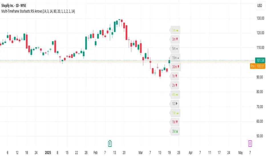 The indicator calculates the Stochastic RSI for each of 12 common timeframes (1m to 3M) and represents directional movements with intuitive arrows: