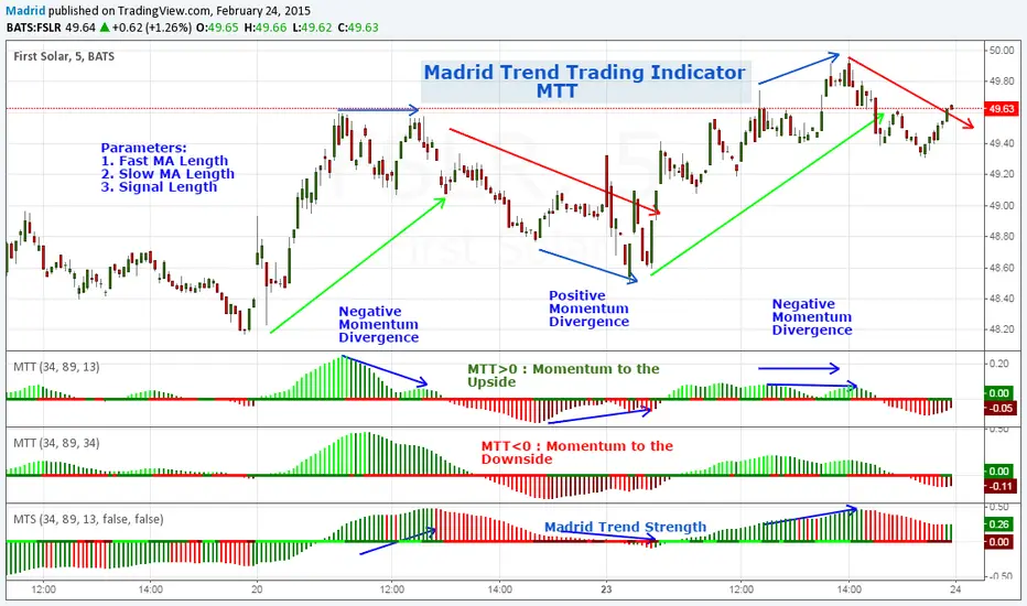 Madrid Trend Trading is an indicator that shows Momentum direction and strength based on a given trend (pair of MA's). It is useful to detect the direction of the trend, Momentum divergences with the trend and possible trend reversals.