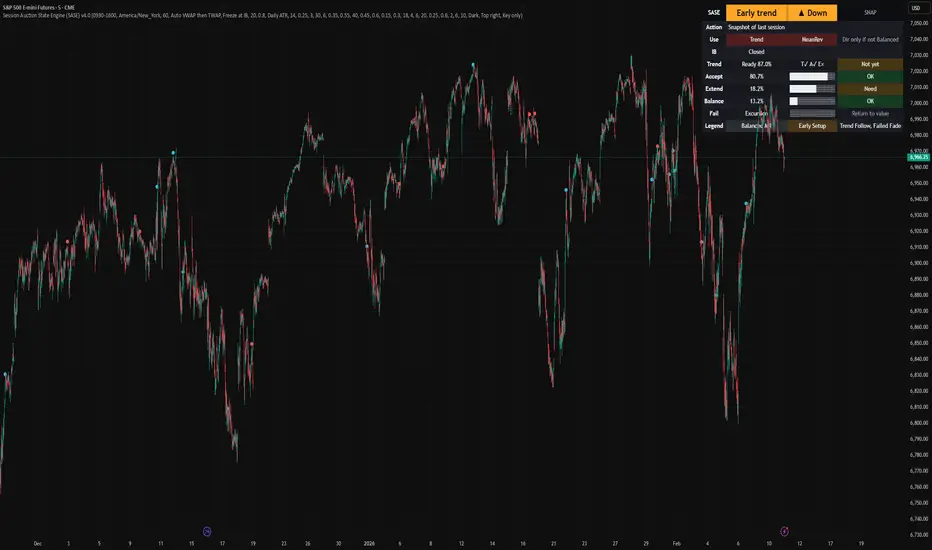 Session Auction State Engine (SASE) is a session context indicator for liquid futures, FX, equities, and crypto on intraday to daily timeframes. It classifies the current session into one of four auction regimes, Balanced, Early trend, Trend continuation, or Failed auction, so you act only when multiple acceptance and expansion conditions align. It is original because it outputs a single interpretable auction state, not buy and sell signals, by combining time acceptance, range expansion, and return to value logic into a compact dashboard. Add it to a clean chart, read the table for Action and permissions, and use the optional markers and bands for quick visual context. Shapes can move while the bar is open and settle on close, for conservative workflows use alerts on bar close.