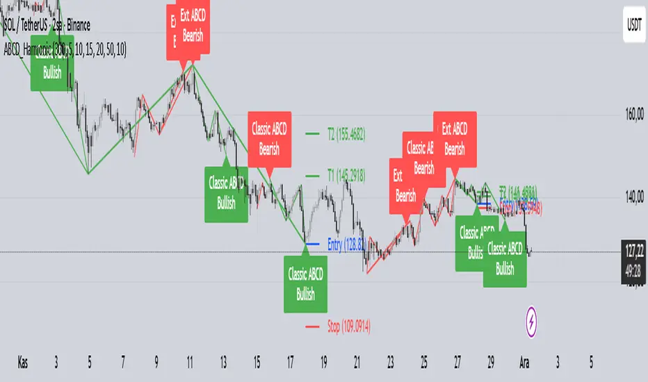 Description: This indicator is a specialized tool designed to detect and visualize three specific types of ABCD harmonic patterns: AB=CD, Classic ABCD, and Extending ABCD. Unlike generic harmonic scanners, this tool focuses strictly on ABCD structures with custom-tuned logic for higher precision and actionable trade setups.