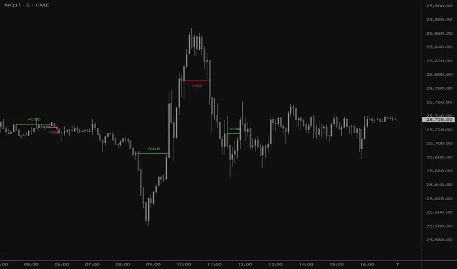 The CISD (Change in State of Delivery) indicator is a precision price action tool designed to help traders identify key reversal points based on ICT concepts. Unlike standard support and resistance indicators, this script tracks the specific algorithmic opening prices responsible for the current delivery state and highlights when that state has been invalidated.