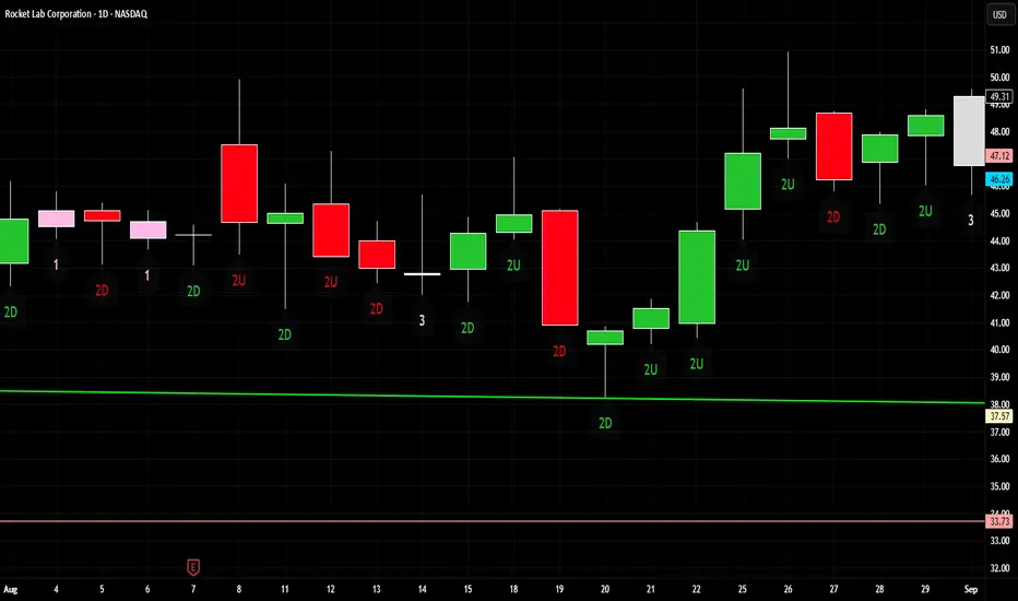 This script uses TheStrat candle numbers 1, 2D, 2U, 3 and places the text below or above. You can also change the text size. This also allows you to change the colors of the candles with two options for the 1 & 3 so you can color them in the direction they are going. For example a 1 that is green can be green and a 1 that is red can be red.