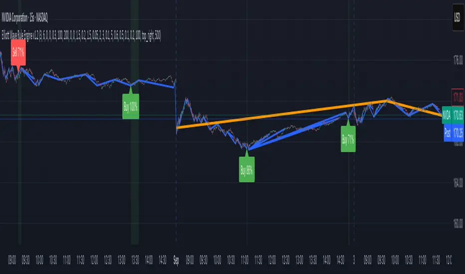 Signals fire only on new Small pivots and only if a Small motive just validated:Direction comes from the motive’s W1 (up = bull, down = bear).