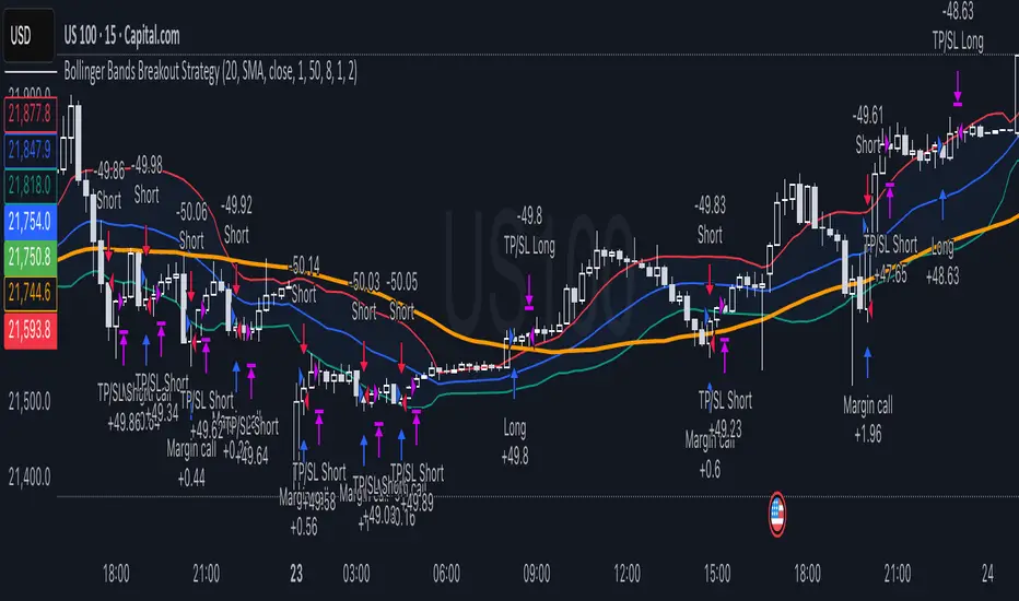 Notes: This simple strategy can be used at any timeframe (I prefer the 15min for day trading). It avoids consolidation, when the price is inside the Bollinger Bands, and has a good success rate. Adjust the Length of the BB to suit your style of trading (Lower numbers=more volatile, Higher numbers=more restrictive). Also you can adjust the Trend Filter SMA, I presonally chose the 50 SMA. Finally the SL/TP can be also adjusted from the input menu.