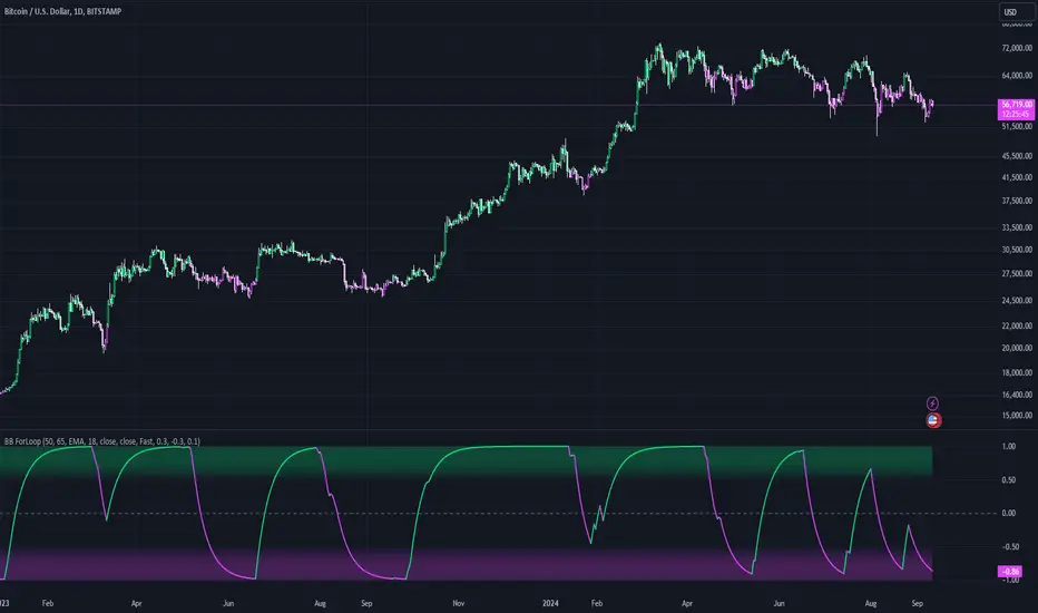 BB ForLoop is an improved version of Bollinger Bands it is designed to calculate an array of values 1 or -1 depending if soruce for calculations is above or below basis.