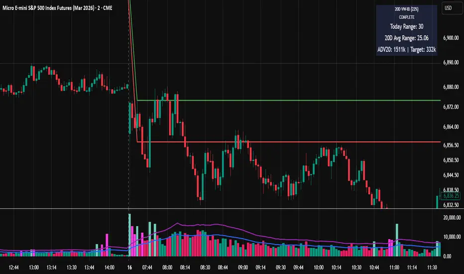 This indicator dynamically calculates and plots a Volume-Weighted Initial Balance (VW-IB) for U.S. equity trading sessions (Regular Trading Hours: 9:30–16:00 ET). Unlike traditional time-based Initial Balance (fixed first 30/60 minutes), this version ends the IB formation when a user-defined percentage of the 20-day Average Daily Volume (ADV) is reached – providing a more adaptive, market-activity-driven range that better reflects actual participation.