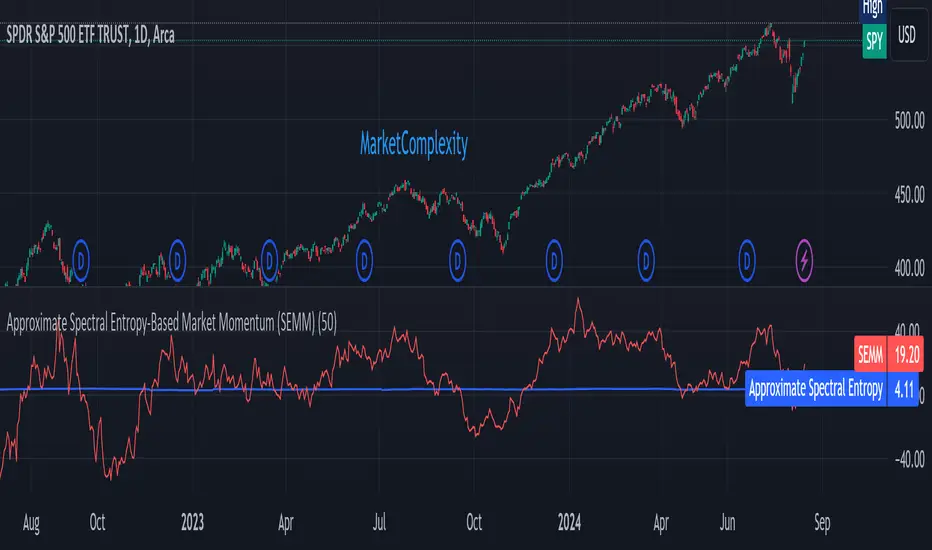 The Approximate Spectral Entropy-Based Market Momentum (SEMM) indicator combines the concepts of spectral entropy and traditional momentum to provide traders with insights into both the strength and the complexity of market movements. By measuring the randomness or predictability of price changes, SEMM helps traders understand whether the market is in a trending or consolidating state and how strong that trend or consolidation might be.