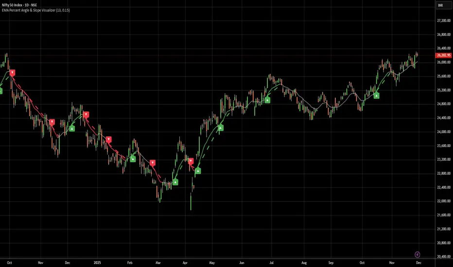 EMA Percent Angle & Slope Visualizer is a powerful trend-strength tool that measures the true geometric slope of an EMA using percent-normalized angle calculations.