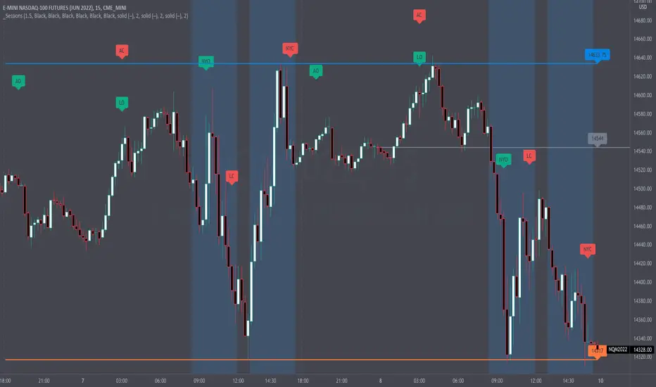 There are three main futures market sessions in a 24-hour period: the London, New York, and Asian Sessions. Each session is given an independent label for the open and close times. The six labels (LO, LC, NYO, NYC, AO, AC) can be individually toggled on or off, the label background color changed, the text switched between black or white, and the height can be lowered or raised. These customizations are intended to give the user full control of the session they are interested in at the moment.