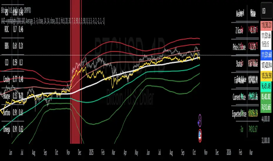 The Universal Valuation Z-Score indicator provides a comprehensive multi-indicator valuation framework by computing Z-scores across momentum oscillators, volatility bands, and risk-adjusted metrics to assess over/undervaluation relative to historical norms. It weights these signals based on correlation strength with price, generates fair value estimates, and highlights extreme levels through color-coded candles and vertical bars for intuitive market positioning.