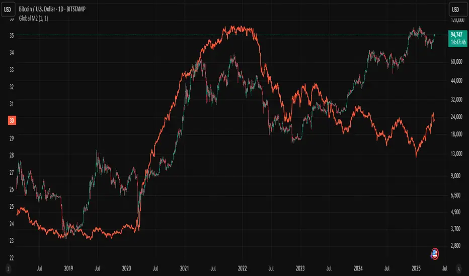 The Global Liquidity M2 Indicator tracks the aggregate M2 money supply across major economies (e.g., US, China, Eurozone, Japan, UK), converted to USD for consistency. M2 includes cash, checking/savings deposits, and easily convertible near-money. It visualizes global liquidity trends, helping investors assess economic conditions and potential impacts on asset prices, like stocks or cryptocurrencies, with higher M2 levels often signaling increased liquidity and economic growth.