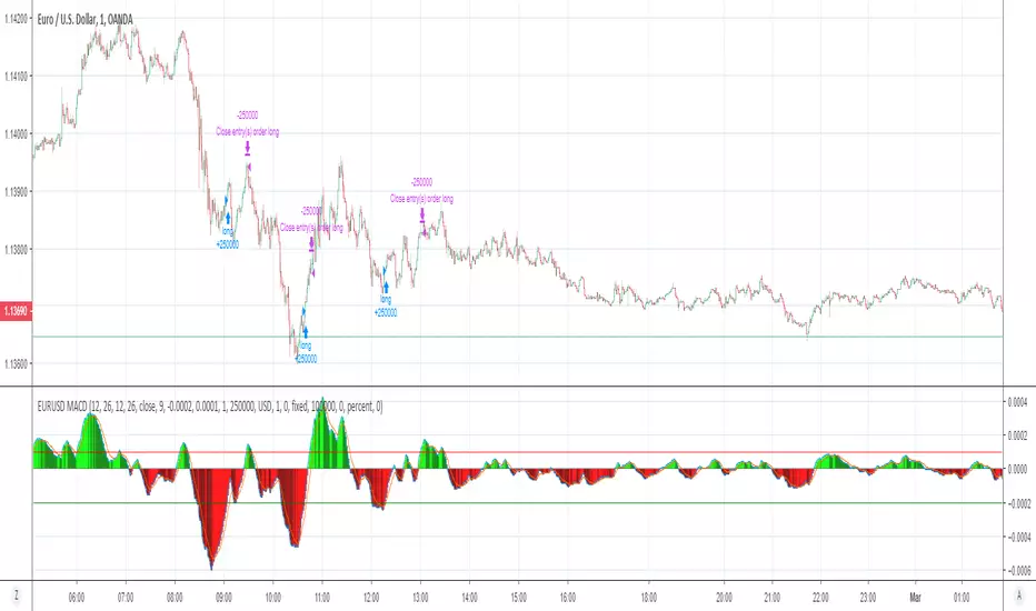 This MACD indicator uses two lines for long and sell long. It also uses a MACD indicator line with a historian. When the MACD historian crosses over the buy line, a long signal is executed. When the MACD historian crosses over the sell line, a close entry is signal is executed. There is a also a built in stop loss and you can adjust the buy and sell lines accordingly.