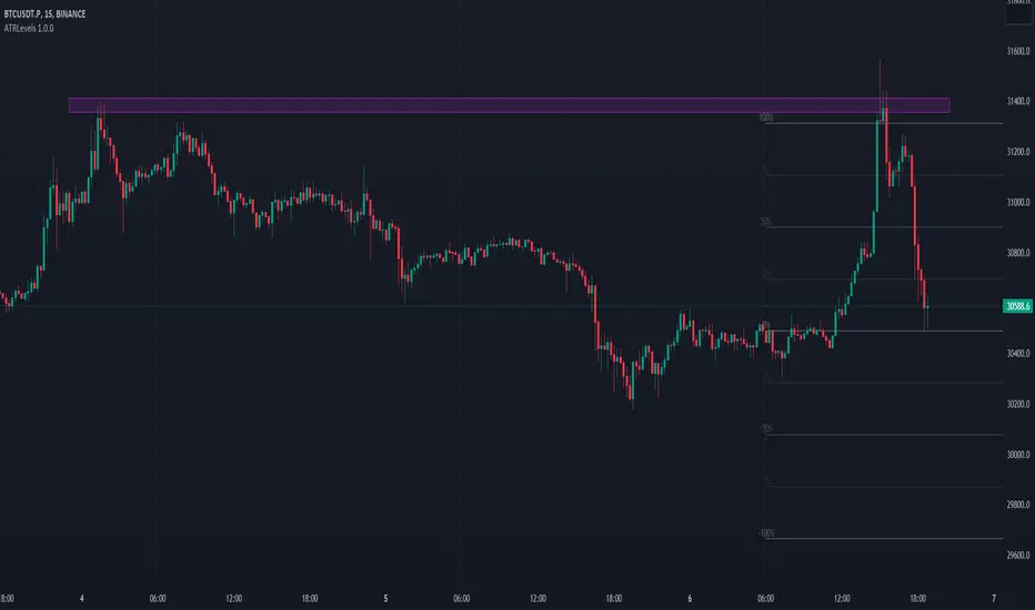 The indicator shows the average daily ATR for the past N days from the beginning of the current session. The range is displayed using levels. If the price has approached the level of 100% or -100% it means that the price has passed its average distance and it is possible to consider points for price reversal. This can be confirmed by daily or weekly horizontal resistance/support levels.