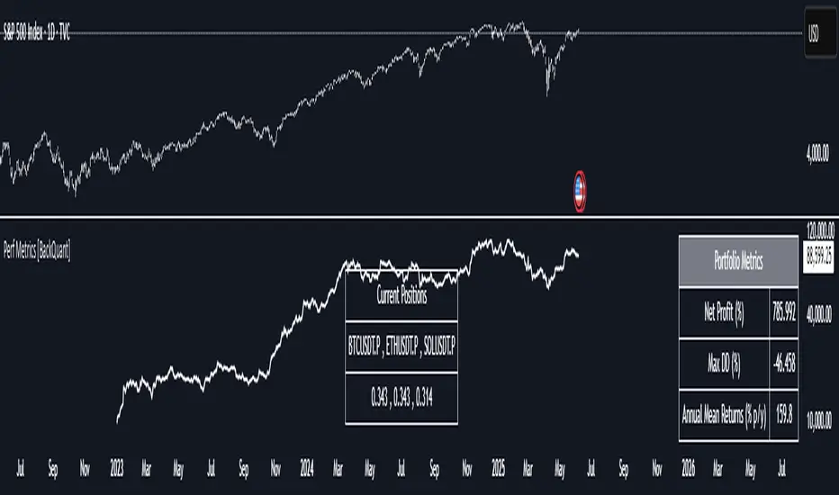 The Performance Metrics With Bracketed Rebalancing script offers a robust method for assessing portfolio performance, integrating advanced portfolio metrics with different rebalancing strategies. With a focus on adaptability, the script allows traders to monitor and adjust portfolio weights, equity, and other key financial metrics dynamically. This script provides a versatile approach for evaluating different trading strategies, considering factors like risk-adjusted returns, volatility, and the impact of portfolio rebalancing.