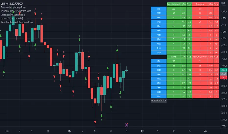 For a visual aid to this indicator please use in conjunction with my Return Line Uptrends, Downtrends, Uptrends and Return Line Downtrends indicators which can all be found on my profile page under scripts, or in community scripts under the same names. Unfortunately, I could not fit all the plots with the correct offsets into one script so I had to make a separate indicator for each trend type. I decided against labels as this would limit the visual data points to 500.