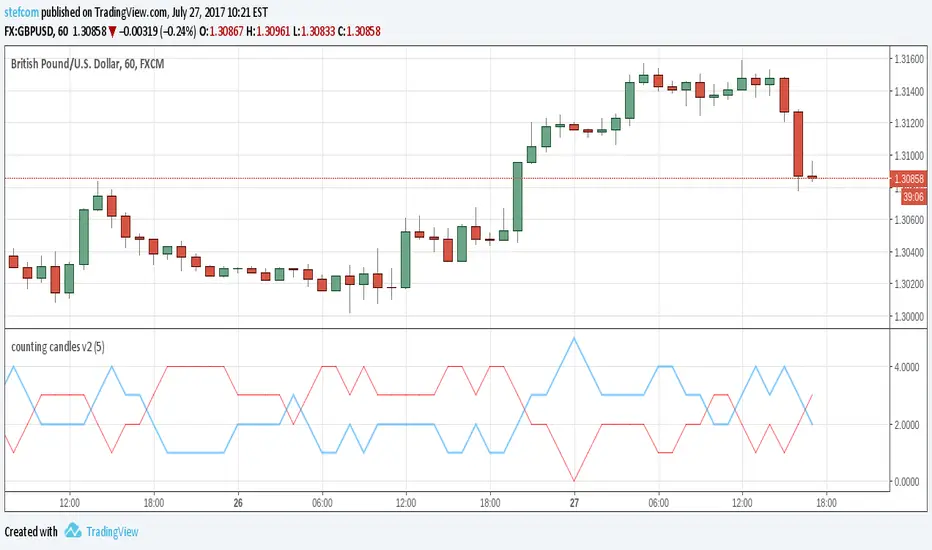 This script shows via the oscillator window, how much red and green candles where shown - looking back a given number of candles.