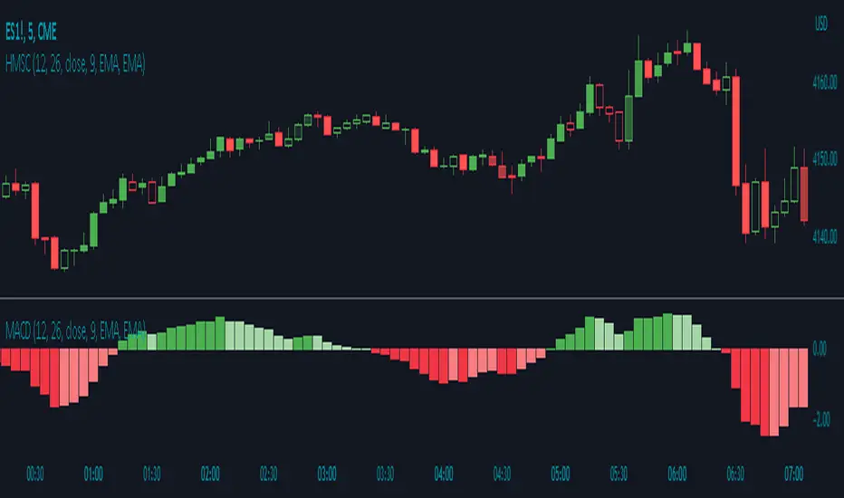 The HMSC indicator calculates the MACD (Moving Average Convergence Divergence) using user-defined parameters such as the fast length, slow length, source, signal smoothing, and moving average types. It then calculates the MACD histogram by subtracting the signal line from the MACD line. The indicator transforms the histogram values into transparency levels for the shaded candles, representing bullish and bearish momentum.