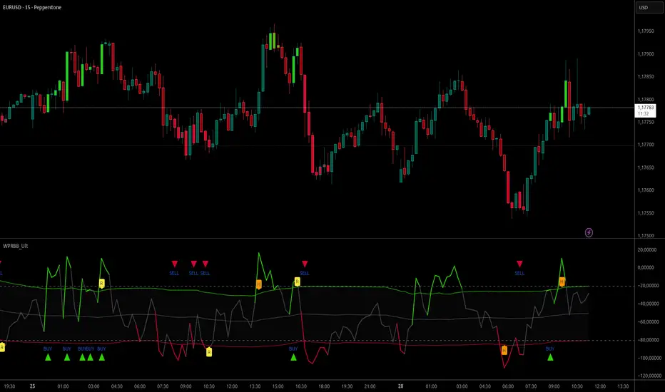 Originality: While inspired by the concept of Williams %R + Bollinger Bands, this code is a custom implementation. It introduces original logic not present in standard library scripts, including: