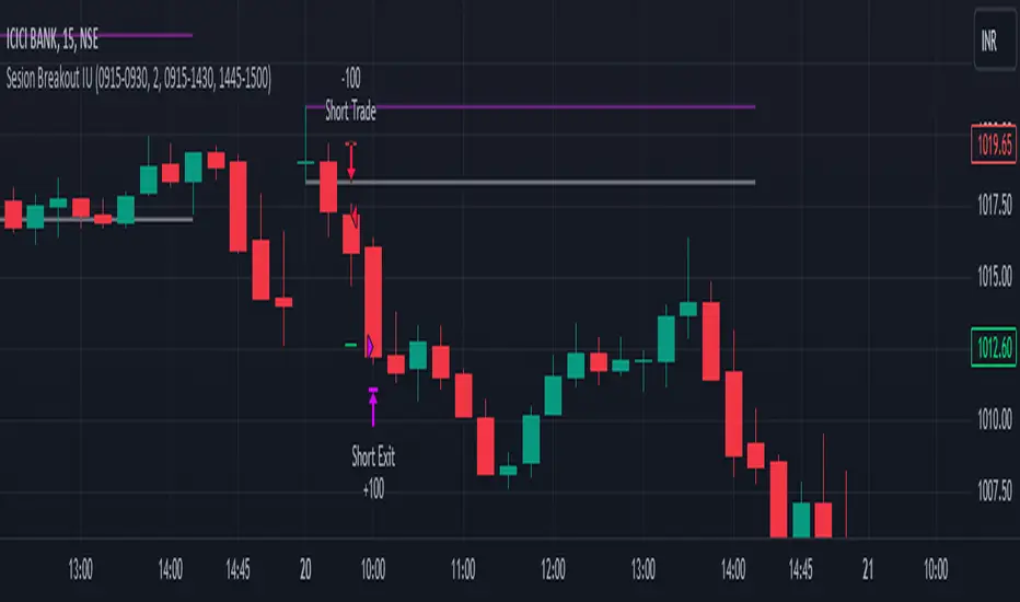How this script works:1. This script is an intraday trading strategy script which buy and sell on the bases of user-defined intraday session range breakout and gives alert(if the alert is set) message too when the new position is open.