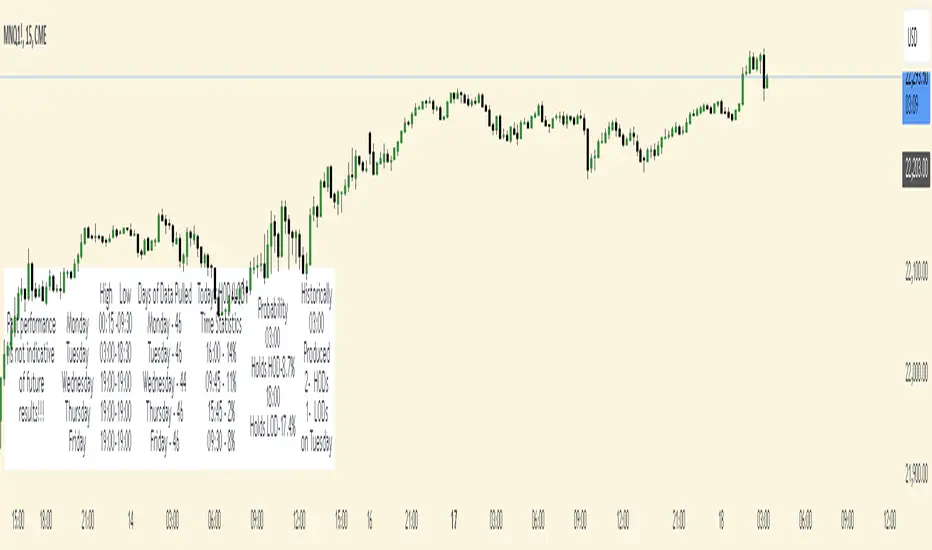 This indicator is a complex time-based statistics tool for analyzing intraday trading patterns. Here's a comprehensive breakdown: