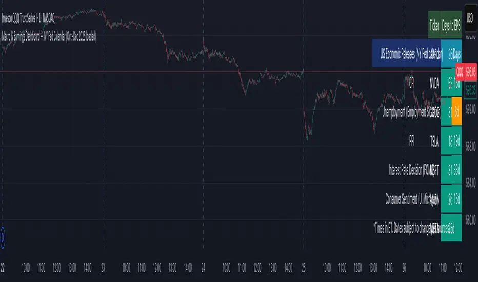 This is an overlay indicator designed to provide a quick, real-time overview of the most critical upcoming US economic data releases and corporate earnings reports directly on your TradingView chart. It functions as a dynamic dashboard, removing the need to constantly check external calendars.