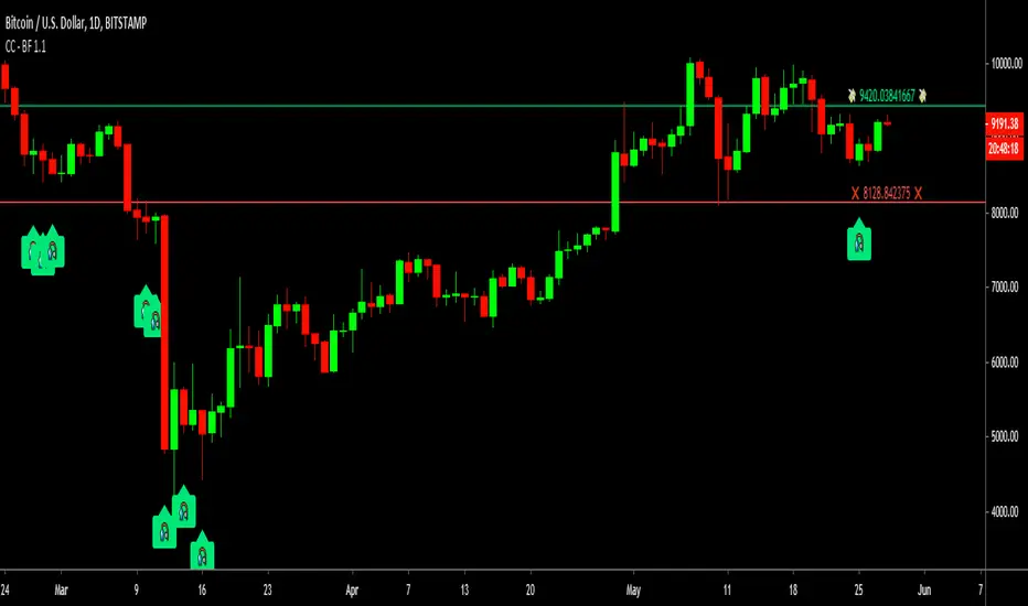Conservative Mode Targeting: In Conservative Mode, Bottom Feeder signals are aggregated into a compound trade. The signal will appear as a green label pointing up below a candle, and will appear upon a candle close. If Bottom Feeder then generates another signal the stop loss and target price will be updated. The process will continue until the aggregated trade completes in either direction. On a trade with multiple signals, a larger position is slowly entered into upon each buy signal.
