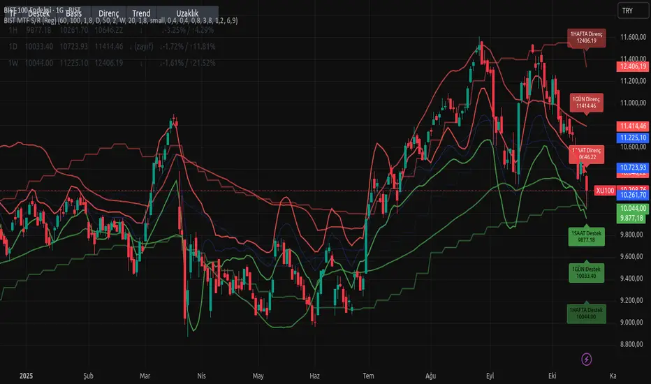 This indicator automatically plots regression-based support and resistance levels for three major timeframes — 1H (short-term traders), 1D (swing traders), and 1W (long-term investors) — all displayed on the same chart.
