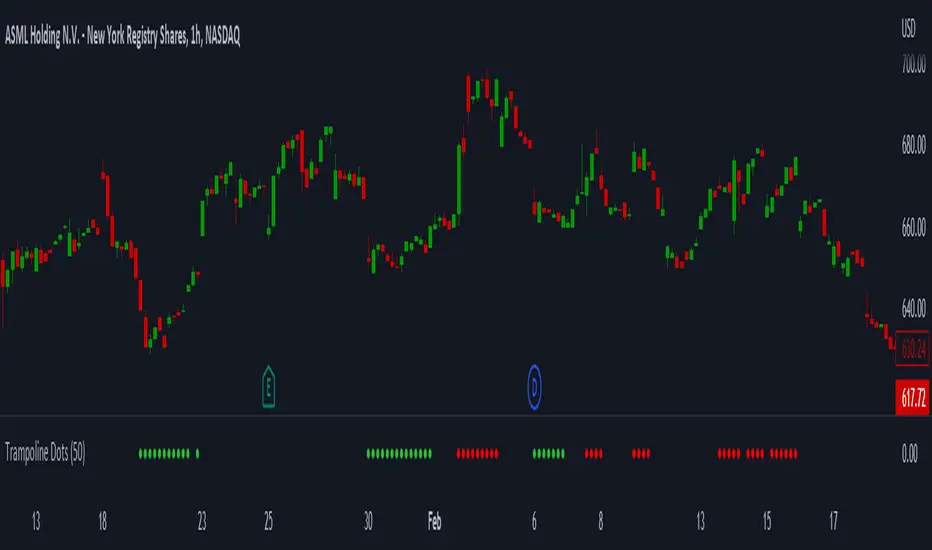 Trampoline Dots serve as a "quick bounce" tool. These little dots will trigger whenever the higher aggregation MACD is above / below zero and the price is below / above the 50 period simple moving average. When these criteria are met, the price is usually under pressure of strong divergence, more often than not price will sharply reverse into the trend direction usually within the next few bars.