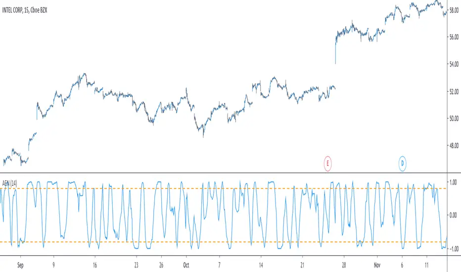 The interpretation is the same as any other type of oscillators, overbought/sold levels are also provided (-0.8,0.8) by default.