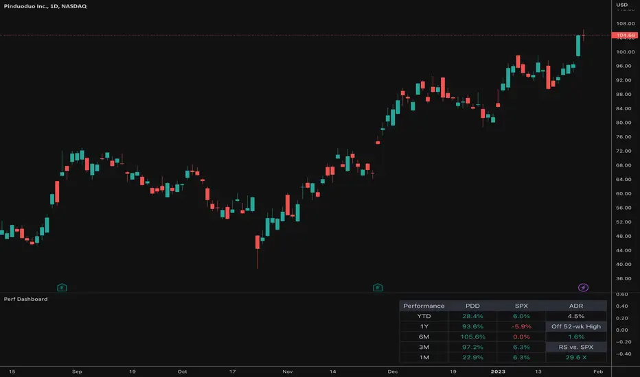 This is a smaller and cleaner version of my previous Relative Performance table. It looks at the rate of change over 1M, 3M, 6M, 1YR & YTD and displays those for the current chart's ticker vs. an index/ticker of your choosing (SPX is default). I also have some fields for the ADR of the displayed chart, how far away the displayed chart is from 52-week highs, and a single number that compares the average relative strength of the displayed chart vs. the index. The way this average calculates is customizable by the user.