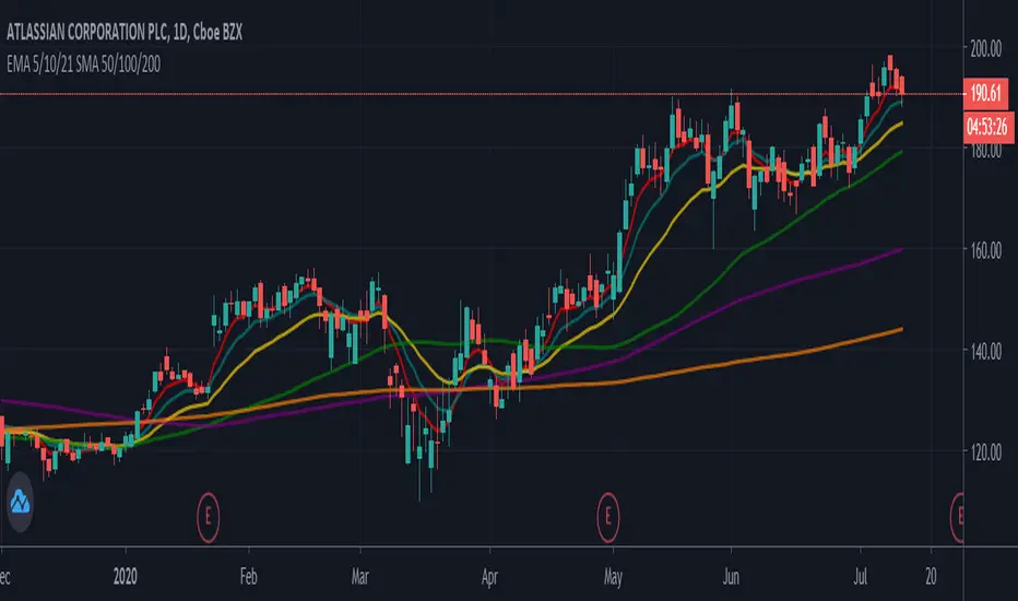 The Script is mixture of both EMAs and SMAs. EMA 5/10/21 are powerful indicators for short term providing more weightage to the recent prices. SMA 50/100/200 provide the long term view.
