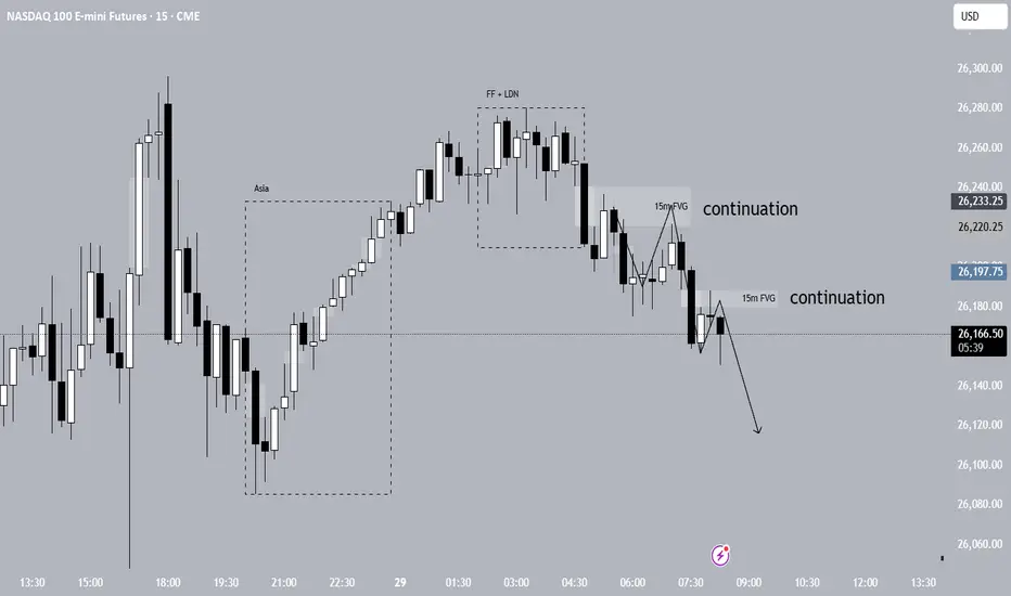 This indicator will help you detect 15m FVGs on NQ. After setting the alert, you can check the chart to see if the FVG aligns with the Bias. This way, when the price reenters this FVG, we can check the LTF for an IFVG that aligns with the Bias. If you find this FVG interesting, set a manual alert on the FVG again, let the price return, and see if you can initiate a continuation trade towards the clear DOL.