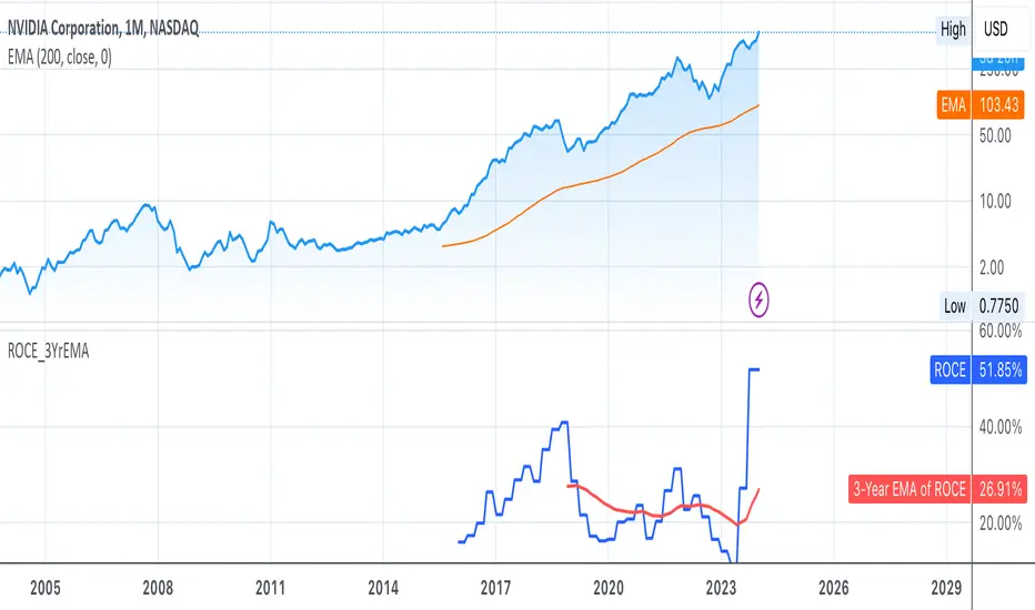 - 3-Year EMA Overlay: The script features a 3-year EMA of the ROCE, providing a smoothed, long-term trend line. This EMA helps in identifying broader trends in a company's operational efficiency and profitability, making it easier to spot deviations from the historical norm.
