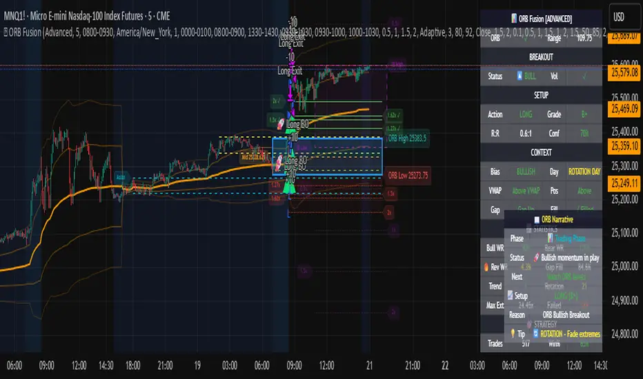 • Targets at Fibonacci extensions (1.0x, 1.618x, 2.5x ORB range)