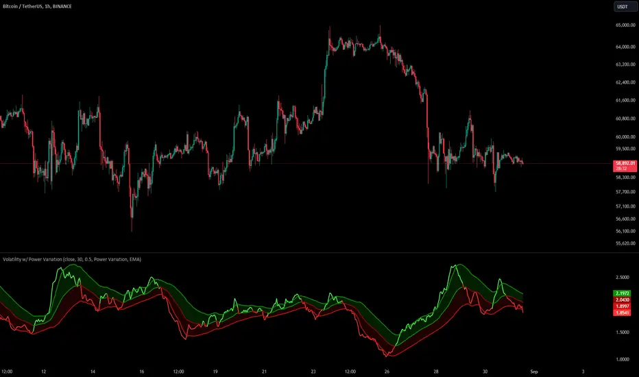 The "Volatility with Power Variation" indicator is designed to measure market volatility. It focuses on providing traders with a clear understanding of how much the market is moving and how this movement changes over time.. This indicator helps in identifying potential periods of market expansion or contraction, based on volatility.