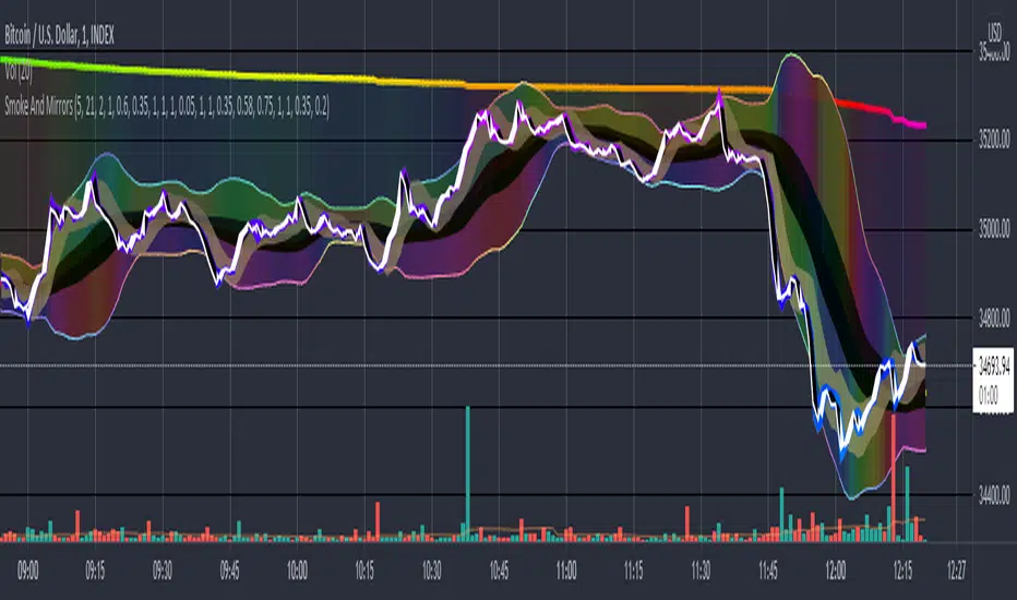 Smoke And Mirrors is an indicator combining few simple but often used indicators to a delightfully visual presentation. Smoke And Mirrors features a generic SMA from where it derives BBands and a Standard Deviation band, and in it's default configuration offers a small timescale Average True Range and also matches the generic SMA against VWAP in an oscillatory fashion. And that's not all! It also has very unique voodoo on top of it all, charting the distance between open and close and the distance between high and low based on the average of open, close, high and low. It's pretty intuitive and while the settings have numerous variables to tweak, they're mostly related to how the colors are displayed so you can set it up to match your current charts colors. The default settings are meant for charts with a normal change of around 1 unit, so if you're charting something that's in it's tens of thousands and varies daily by a 1000 or more, you might want to tone the "rate-of-change" numbers down to all the way to 1. Other than that, it's recommended that you play around with the numbers a little bit so that you know which band represents which indicator.