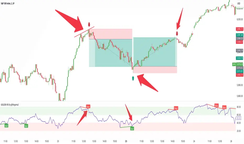 GOLDEN RSI thejamiul is a versatile Relative Strength Index (RSI)-based tool designed to provide enhanced visualization and additional insights into market trends and potential reversal points. This indicator improves upon the traditional RSI by integrating gradient fills for overbought/oversold zones and divergence detection features, making it an excellent choice for traders who seek precise and actionable signals.