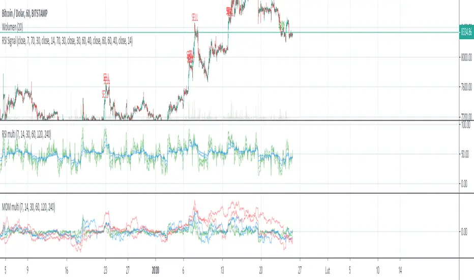 Signal of Overbought and Oversold based on 4x interval of RSI and Momentum. You can change interval and source