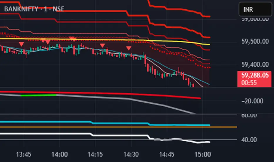 It is TREND indicator. it has 8 supertrends which can be used for different higher time frame & with different atr & multiplier.which will give better idea of varius trend like long ,medium,short & immediate trend.it also has daily & weekly vwap. and two sma with adjustable length & timeframe. source used for calculation of supertrends is 1min HA candles.yyou can use it onnormal japnees candle also.