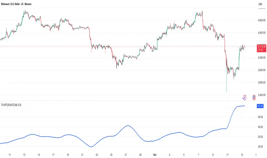 The T3 smoothing algorithm provides improved responsiveness compared to traditional RMA smoothing used in standard ATR. The triple exponential design with volume factor control allows the indicator to respond more quickly to genuine volatility changes while maintaining the ability to filter noise through appropriate VF settings. This results in earlier detection of volatility regime changes compared to standard ATR, particularly valuable for risk management and position sizing adjustments.