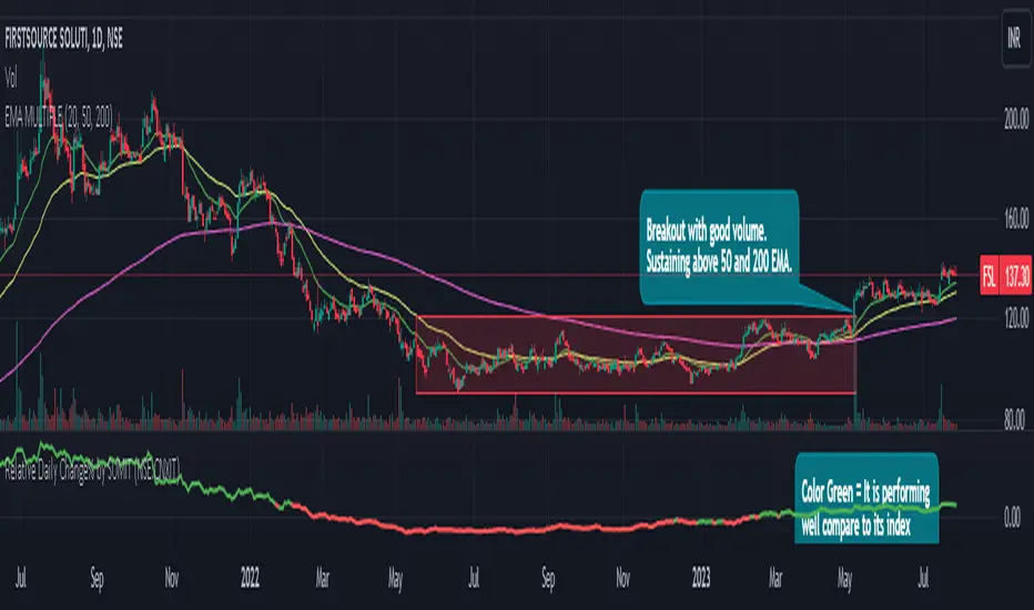 I use this during a breakout to see whether the stock is performing well with comparison to it`s index. As I marked in the chart there was a range zone (red box), we got a breakout with good volume and it is also sustaining above 50 and 200 EMA, the RDC color is also in green so as per my indicator it is performing well. This is how I do fine-tuning of my analysis for a breakout strategy.