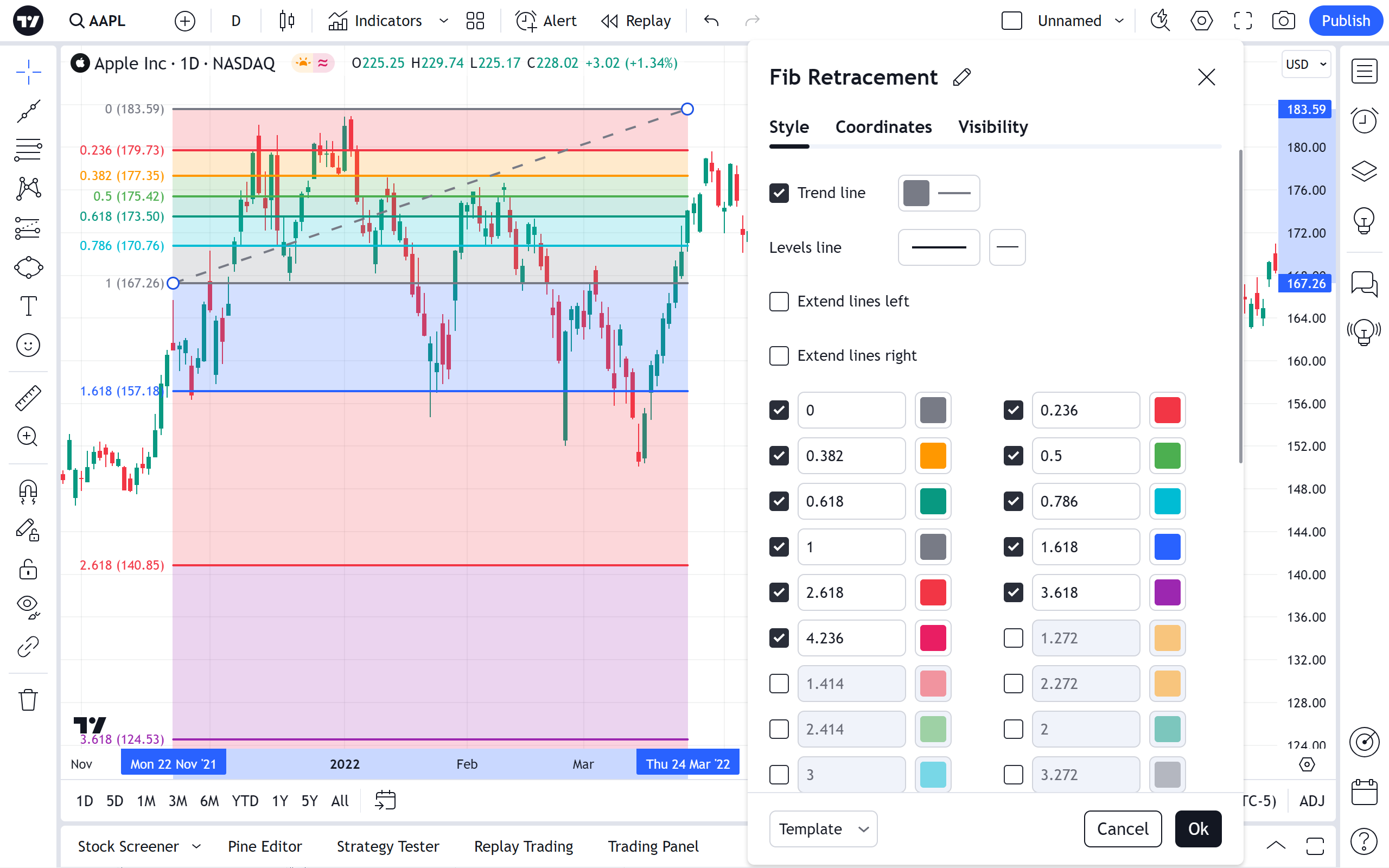 Công cụ Fib Retracement bao gồm khả năng thiết lập 24 mức Fibonacci khác nhau (bao gồm các mức 0% và 100% được xác định bởi hai điểm cực trị của đường xu hướng được vẽ ban đầu). Giá trị từ 0 đến 1 là mức thoái lui nội bộ. Giá trị lớn hơn 1 là mức thoái lui bên ngoài, trong khi giá trị nhỏ hơn 0 là phần mở rộng. Một hộp kiểm có sẵn cho mỗi cấp đã xác định, cho phép bật hoặc tắt cấp đó cho mục đích hiển thị.